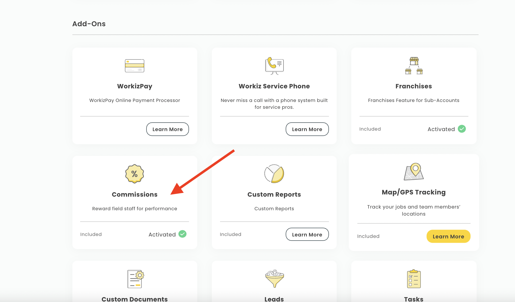 2. Search for the "Commissions" add-on by scrolling down, using the search bar, or by clicking on one of the categories and click on "Learn More".
