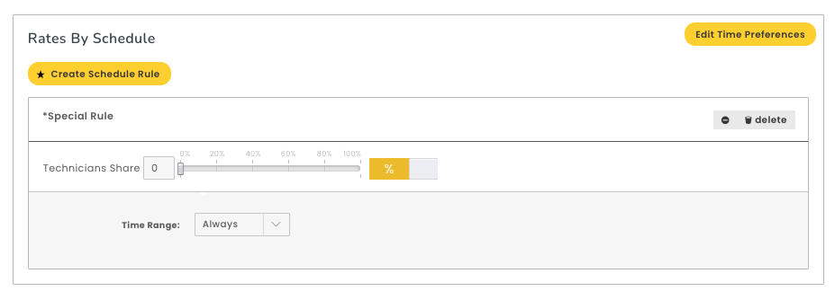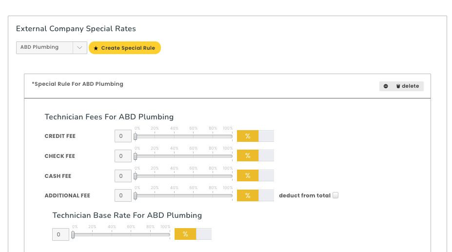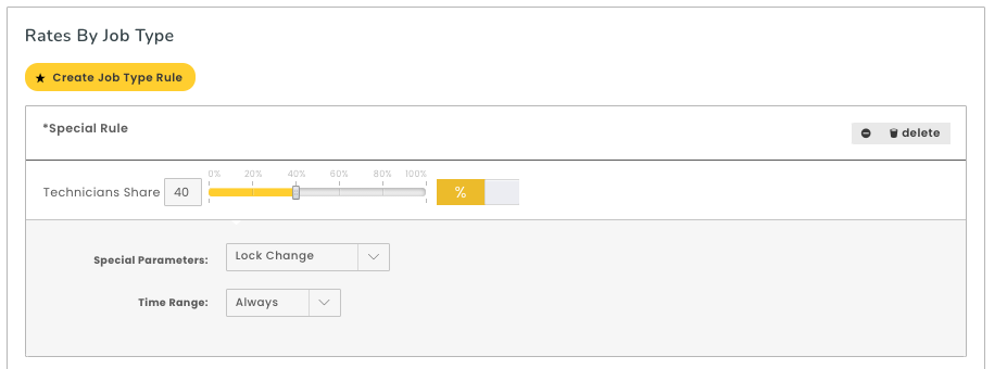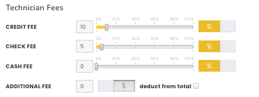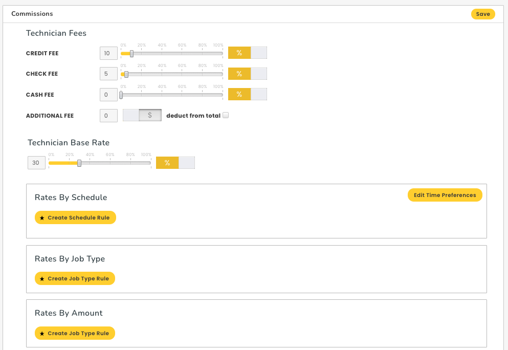 Technician base rate: When a job closes this is the rate taken out for this tech from the total, after fees are deducted. You can set rates by a percentage or specific amount.