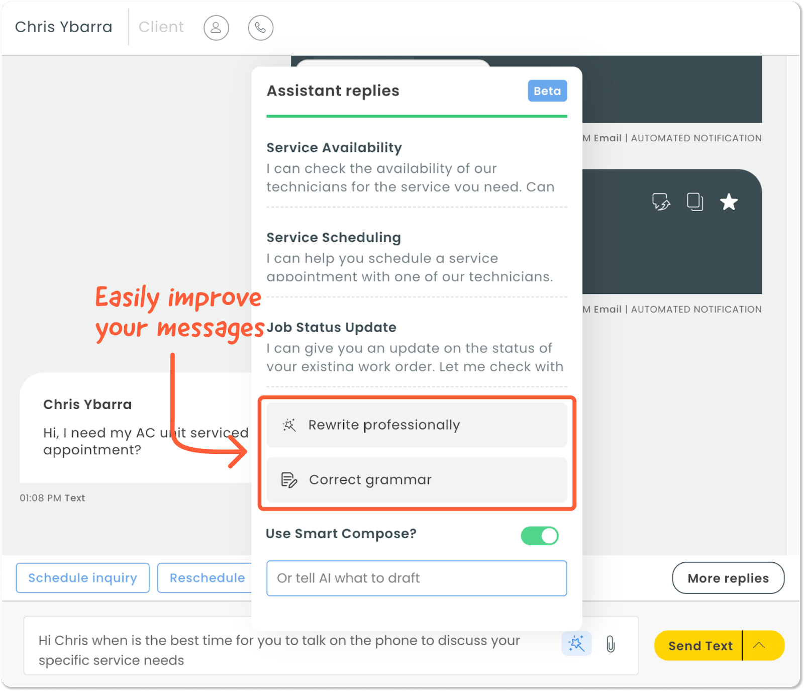 Smart Messaging will instantly transform the way you interact with clients. With just a few clicks, Smart Messaging can easily compose new messages, provide you with relevant replies, or edit your existing messages to be written more professionally. And it does this all with full contextual awareness of the conversation, your client, and your history with this client.