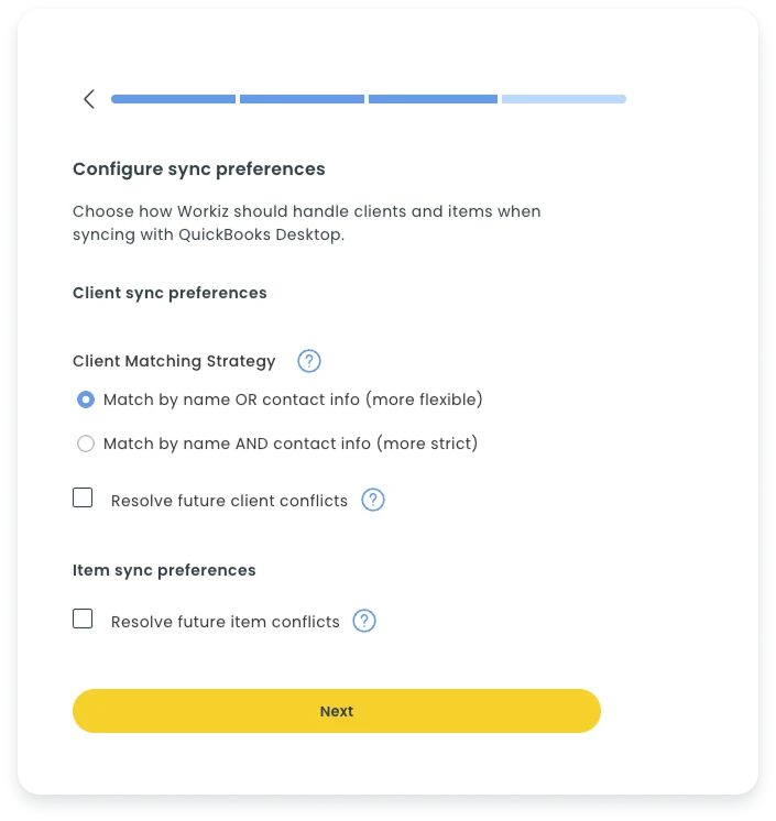 If you chose to import clients and/or items from QuickBooks, you will also need to decide how you want Workiz to handle matching and potential duplicates.
